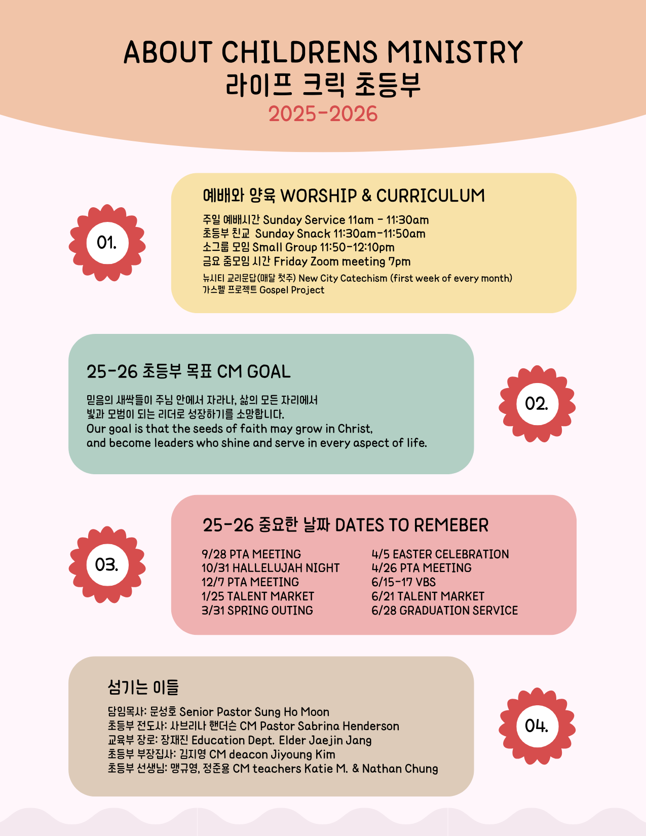 사역 가치: 그리스도 안에서 함께 성장하며, 아이들, 가족들과 관계를 형성하기 위해 명확하고 일관된 소통을 중요시한다.